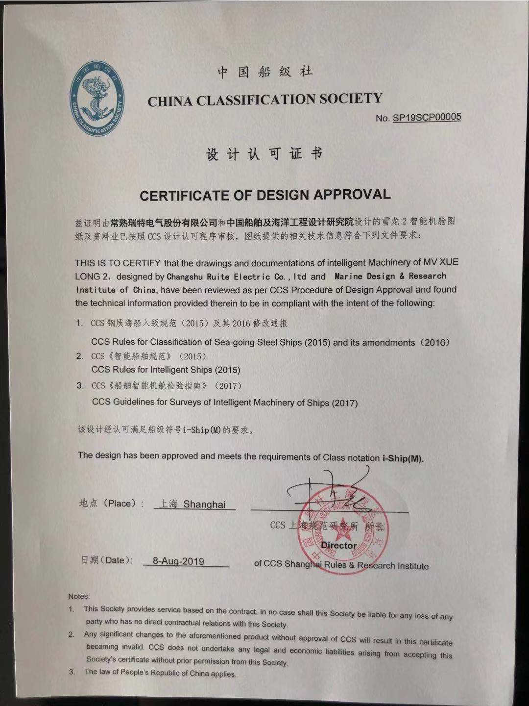 中國(guó)船級(jí)社頒發(fā)的設(shè)計(jì)認(rèn)可證書充分說明了由常熟瑞特電氣股份有限公司和七〇八所設(shè)計(jì)的“雪龍2號(hào)”智能機(jī)艙已按照中國(guó)船級(jí)社設(shè)計(jì)認(rèn)可程序?qū)徍?,并符合中?guó)船級(jí)社《智能船舶規(guī)范》、《船舶智能機(jī)艙檢驗(yàn)指南》等相關(guān)技術(shù)要求,滿足了船級(jí)符號(hào)i-Ship(M)的要求。2017年12月瑞特股份與極地中心、江南造船廠三方達(dá)成“智能機(jī)艙加裝合作協(xié)議”標(biāo)志著智能機(jī)艙項(xiàng)目正式開展,歷經(jīng)系統(tǒng)設(shè)計(jì)、圖紙送審、設(shè)備發(fā)貨、設(shè)計(jì)認(rèn)可到最終的實(shí)船驗(yàn)收,瑞特股份始終牢記使命、兢兢業(yè)業(yè),為我國(guó)的科考事業(yè)、海洋事業(yè)奉獻(xiàn)著自己的力量。
