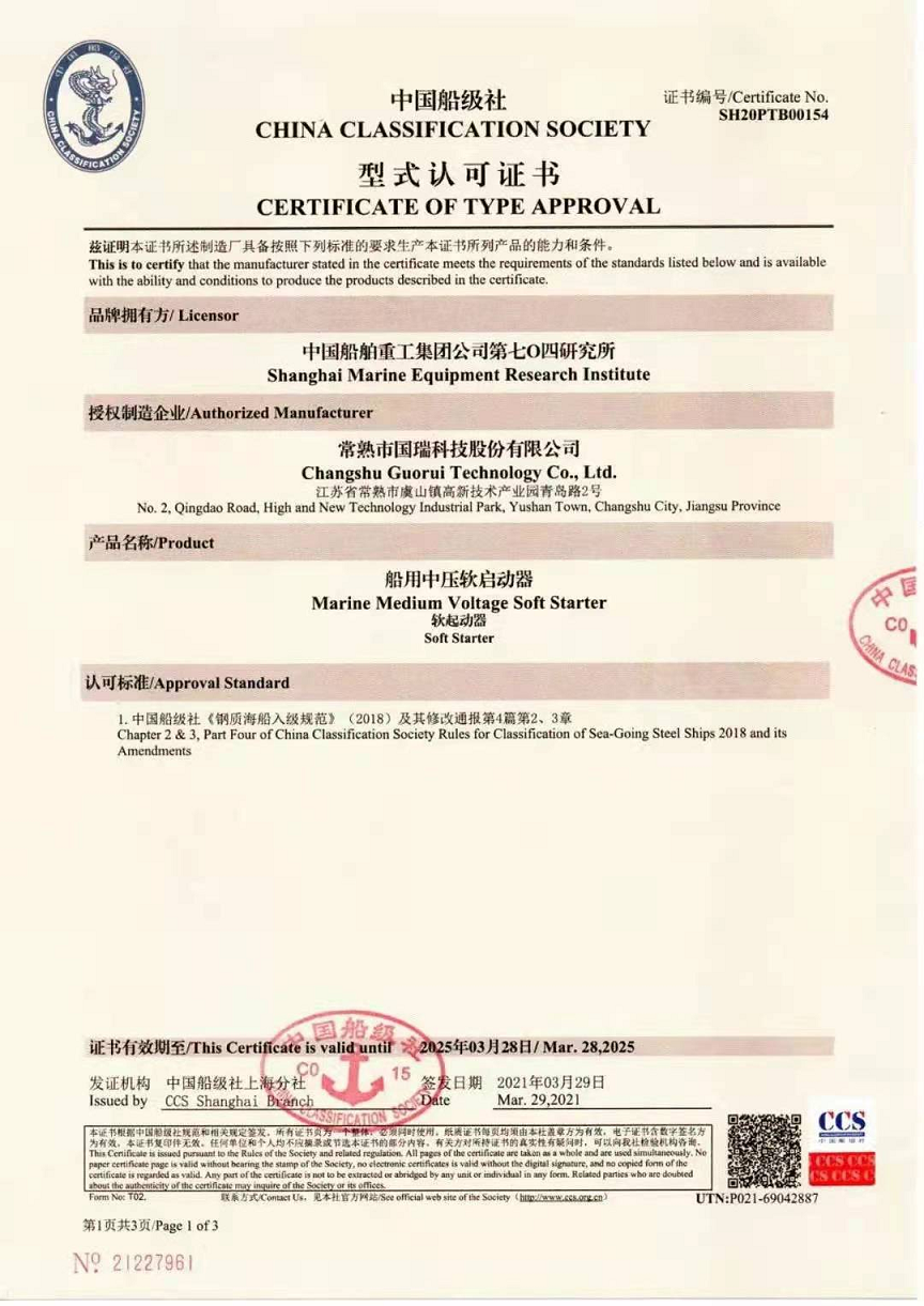 近日,由中船集團704所與常熟市國瑞科技股份公司聯(lián)合研發(fā)的6.6KV/3MW船用中壓軟起動器獲得中國船級社(CCS)型式認可證書。這是國產(chǎn)自主品牌船用軟啟動器首次獲得CCS船級社型式認可證書。此前此類產(chǎn)品國際上只有以色列索控公司和美國羅克韋爾公司才能生產(chǎn)。