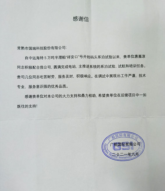近日,常熟市國(guó)瑞科技股份公司又收到了來(lái)自廣船國(guó)際有限公司的感謝信。