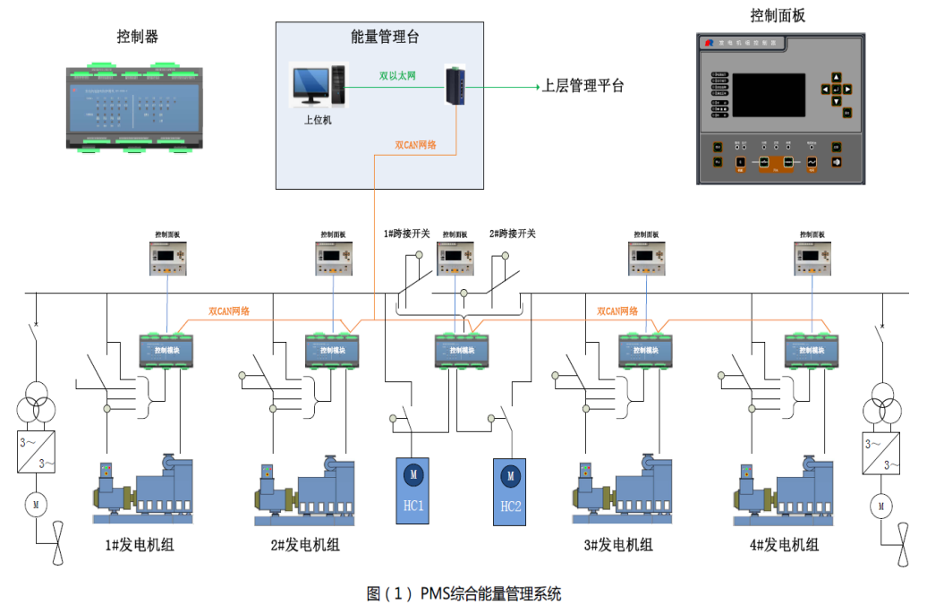 在半自動(dòng)和自動(dòng)二種控制模式下發(fā)電機(jī)組具有自動(dòng)啟動(dòng)、同步合閘、解列分閘、停機(jī)功能;對(duì)并聯(lián)機(jī)組具有自動(dòng)調(diào)頻、調(diào)壓、有功無(wú)功分配等綜合調(diào)控功能