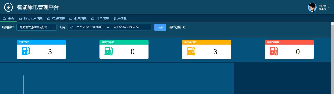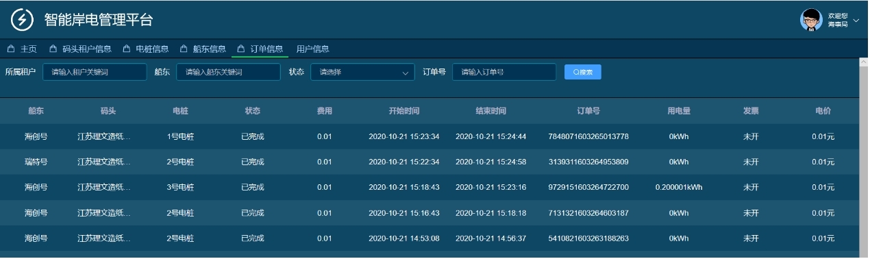智能岸電管理功能,碼頭租戶通過PC端登錄服務(wù)器對岸電樁進(jìn)行管理,包括電樁信息、船東信息、訂單信息管理等。海事局通過登錄服務(wù)器可以讀取碼頭租戶、船東、訂單等信息