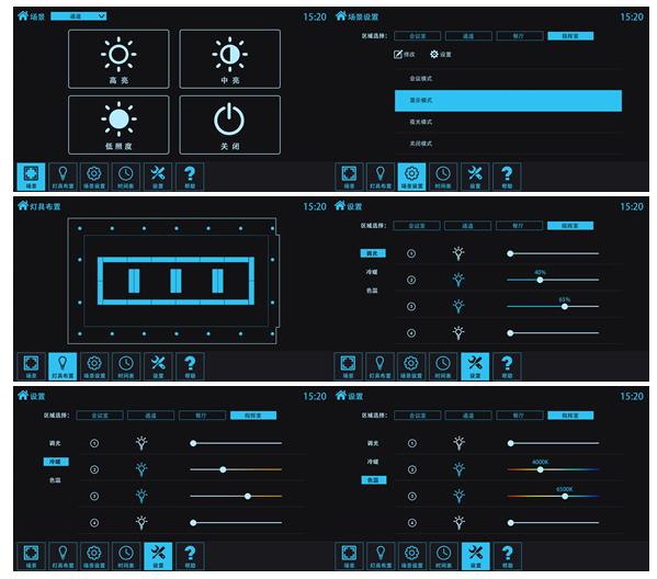 可通過(guò)面板選擇已配置的情景模式,實(shí)現(xiàn)對(duì)應(yīng)場(chǎng)景下對(duì)燈具的開(kāi)關(guān)、色溫、光通量狀態(tài)的控制,各組場(chǎng)景模式互不影響