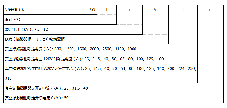 KYJ1型船舶鎧裝中壓配電板按一次回路元件(手車)分為:KYJ1型船舶鎧裝真空斷路器柜(簡稱:斷路器柜)、KYJ1型船舶鎧裝真空接觸器柜(簡稱:接觸器柜),型號命名如下: