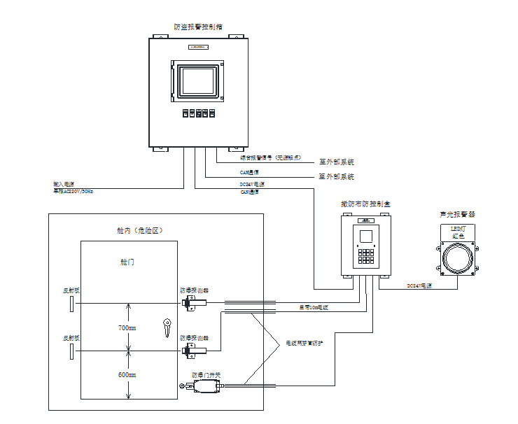 防盜報警控制箱的系統(tǒng)狀態(tài)、報警信息通過CAN通訊發(fā)送至損管通訊模塊,并輸出一路無源常開延伸報警觸點至值班室綜合報警信息裝置;