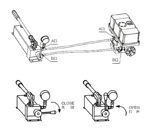 1.將A、B軟管連接到執(zhí)行器的A、B應(yīng)急接口上;